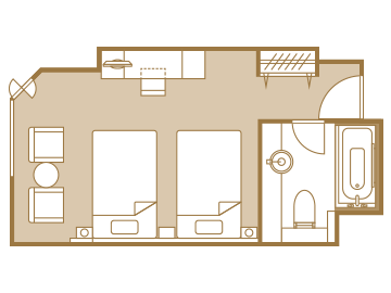 The layout of the room is only an example. Please understand beforehand that the area, the arrangement of furniture, furnishings etc. vary depending on the room.
