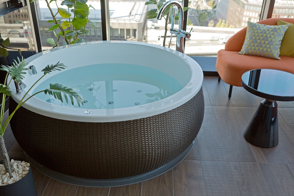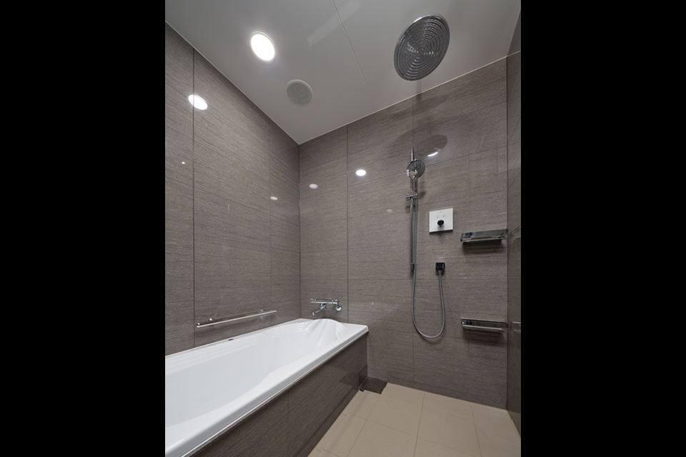 This room expresses the glitter and excitement of the city quarter known as Minami (“south”) that comprises the bustling areas of Namba and Dotombori. The living room is a large luxurious space, perfect for parties with a small number of people. It also contains a Jacuzzi-style view bath surrounded by a large sofa and other décor. Here you and your party can enjoy a commanding view of the Midosuji nightscape.