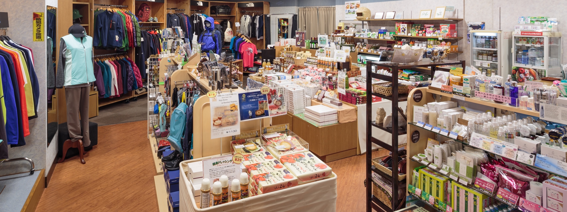 白馬ならではの土産物やスキー用品、トレッキンググッズ、アウトドアウェア等、白馬をさらに楽しめる充実の品揃え。