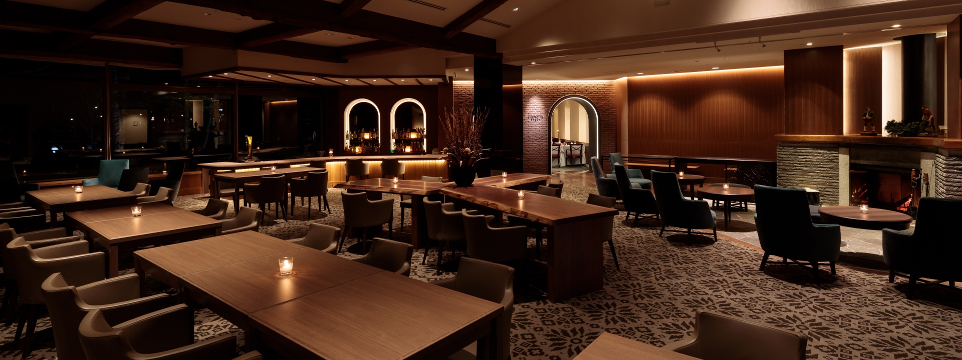 大人の会話とお酒を愉しむバースペース、暖炉の炎の前でくつろぐリビングスペース、