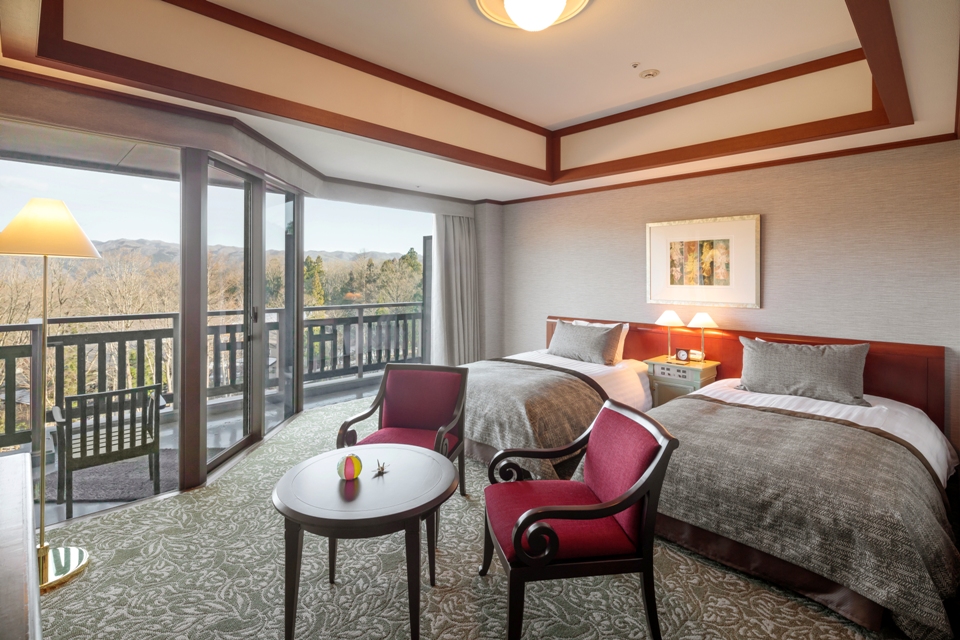 ホテル正面玄関側(東向き)のトップフロアスタンダードツイン、ホテル中庭側・北アルプスの方向(西向き)になるトップフロアスタンダードアルプスツインがございます。
