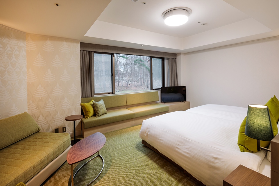 バルコニーはございませんが、ウィンドウソファと、ゆったり寛げるカウチソファ(3名利用時にはベッドとして利用)をご用意。スタジオベッド(ベッドがくっついている)タイプでご用意しております。また、壁に映し出されるポップインアラジン(プロジェクタ)の大画面で、テレビ番組やインターネット、動画サイトなどをお楽しみになれます。