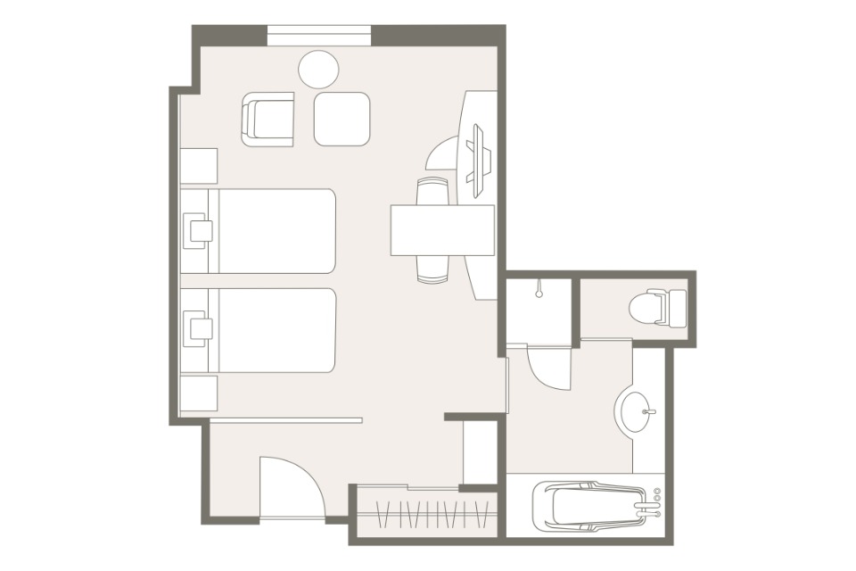 お部屋の間取りはあくまで一例です。面積や家具の配置、備品などはお部屋により異なりますので、あらかじめご了承ください。