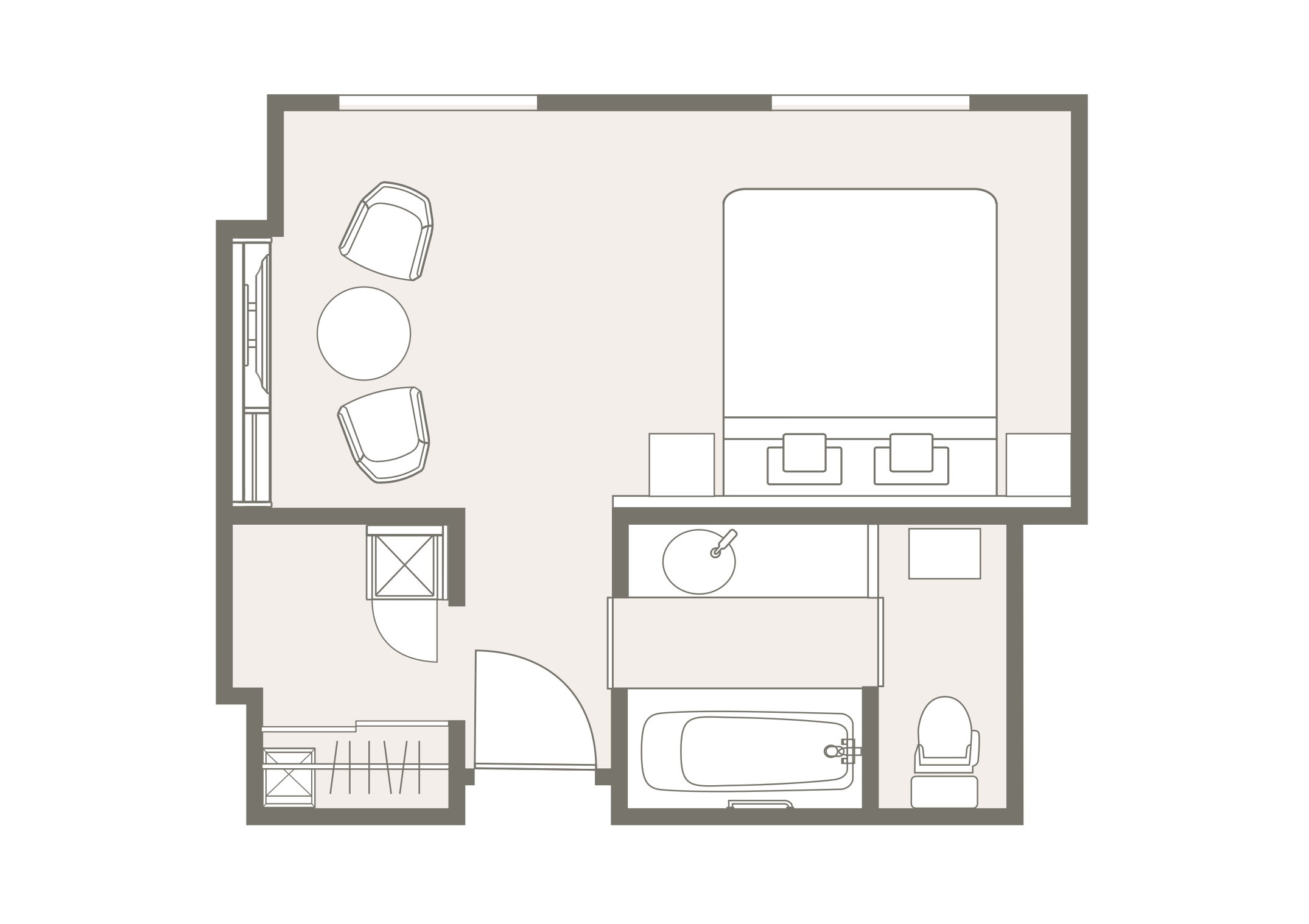 お部屋の間取りはあくまで一例です。面積や家具の配置、備品などはお部屋により異なりますので、あらかじめご了承ください。