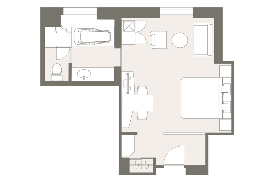 お部屋の間取りはあくまで一例です。面積や家具の配置、備品などはお部屋により異なりますので、あらかじめご了承ください。