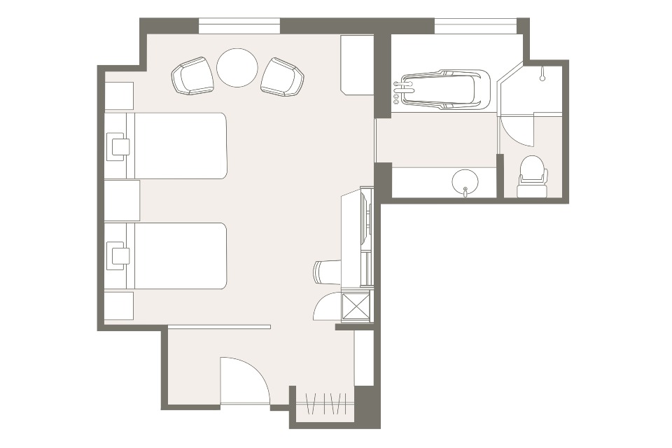 お部屋の間取りはあくまで一例です。面積や家具の配置、備品などはお部屋により異なりますので、あらかじめご了承ください。