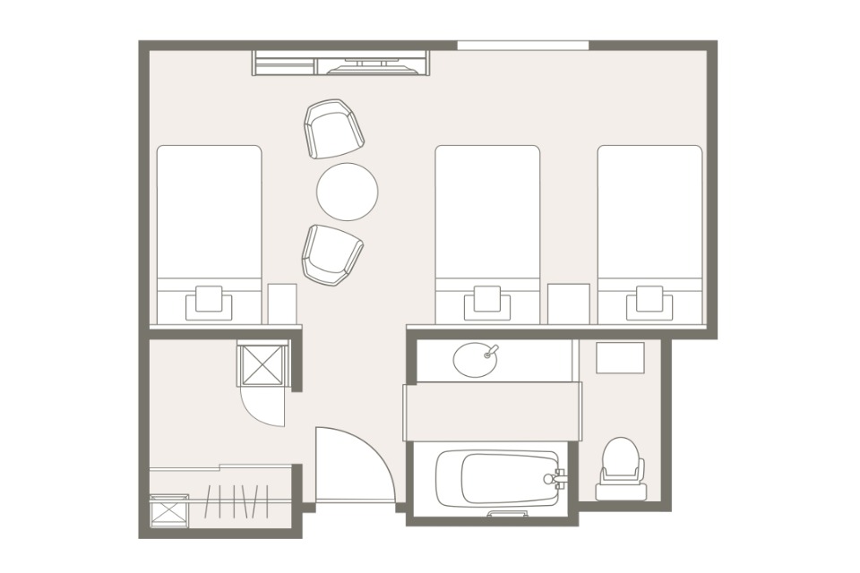 お部屋の間取りはあくまで一例です。面積や家具の配置、備品などはお部屋により異なりますので、あらかじめご了承ください。