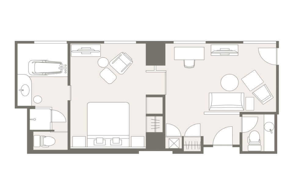 お部屋の間取りはあくまで一例です。面積や家具の配置、備品などはお部屋により異なりますので、あらかじめご了承ください。