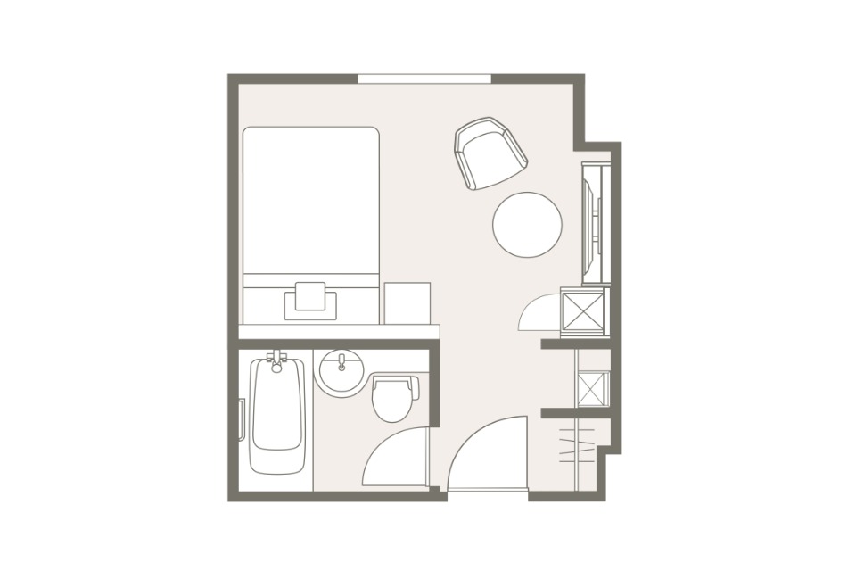 お部屋の間取りはあくまで一例です。面積や家具の配置、備品などはお部屋により異なりますので、あらかじめご了承ください。