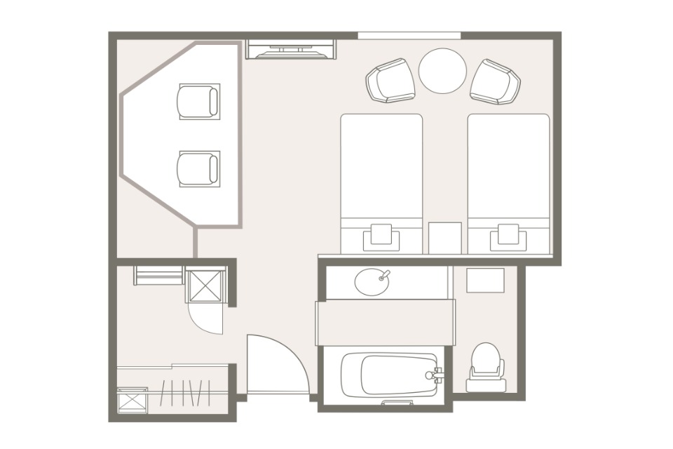 お部屋の間取りはあくまで一例です。面積や家具の配置、備品などはお部屋により異なりますので、あらかじめご了承ください。