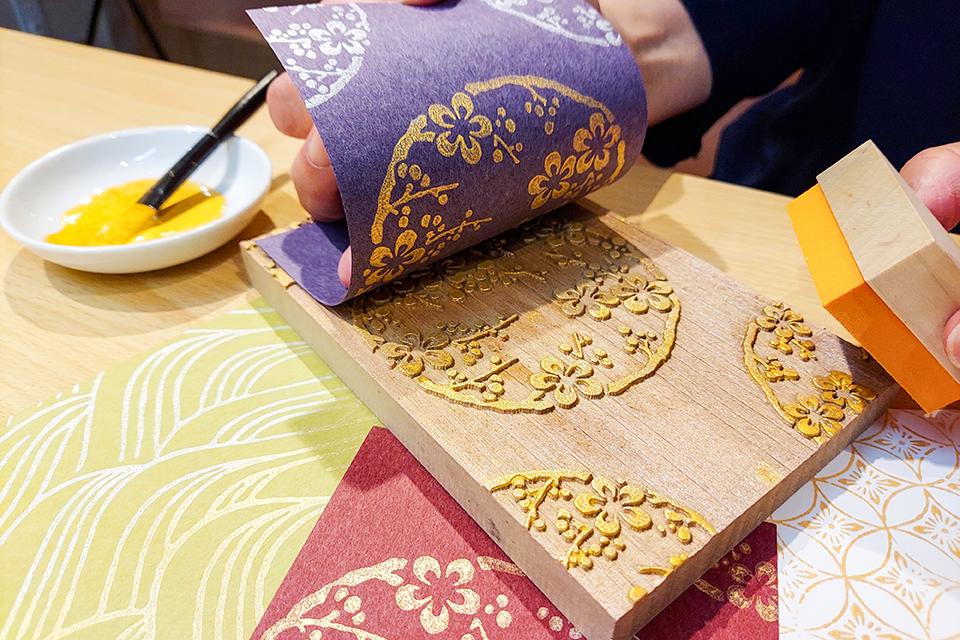 京からかみの伝統技法を間近で感じられる、唐紙工房の見学付き体験プランです。職人による文様制作の工程をご覧いただいた後、実際に版木を用いて唐紙文様を摺る体験をお楽しみいただけます。