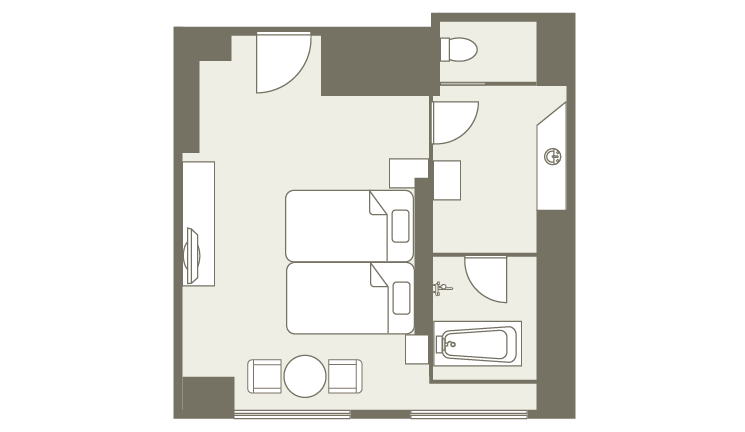 お部屋の間取りはあくまで一例です。面積や家具の配置、備品などはお部屋により異なりますので、あらかじめご了承ください。
