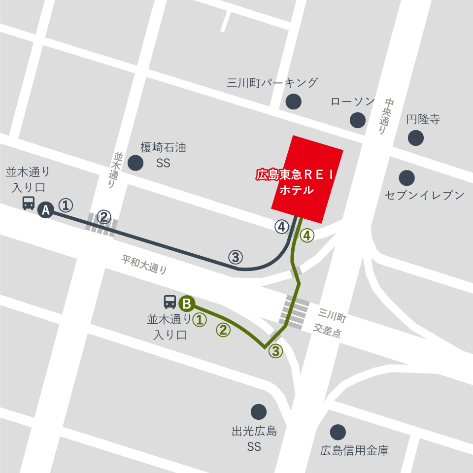 並木通り入口下車後、平和大通り添い東へとお進みください(広島駅へ向かう方向です) ホテルまで約200mです。