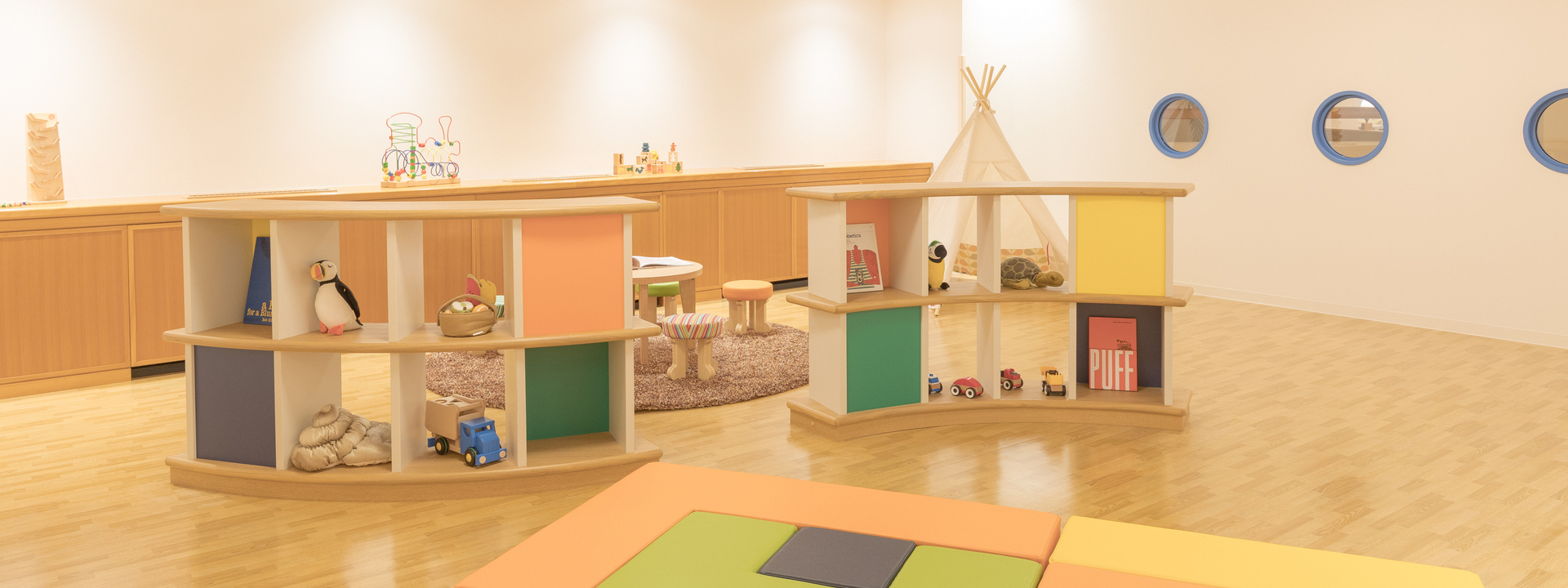 床はクッション素材、家具は固定式、壁にはお子様の様子が分かるよう覗き窓を付けるなどファミリー利用に嬉しい「おしゃれで安心なキッズスペース」です。