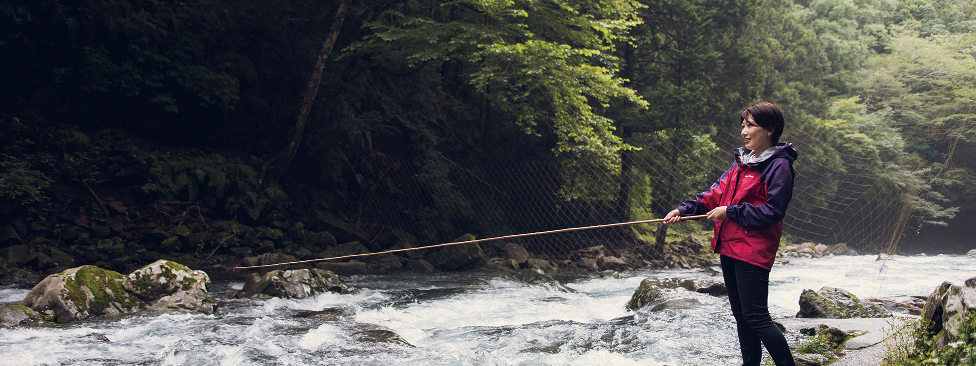 「日本の滝百選」のひとつ、浄蓮の滝でできるニジマスとアマゴの釣り体験。釣り竿や餌などの道具は用意されている(有料)ので、初心者でも気軽に川釣りを楽しむことができる。釣った魚を隣接の施設で焼いて食べられる(コンロ貸出550円)うれしいサービスつき。