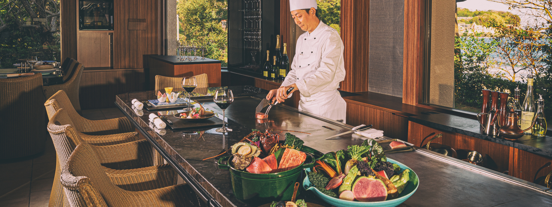 熟練のシェフが伊豆・今井浜ならではの食材を目の前で調理する鉄板焼レストラン。五感を刺激するお食事をお愉しみください。