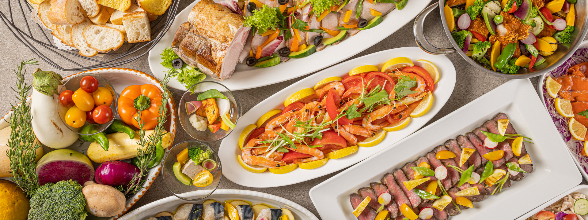 ローストビーフやズワイ蟹・金目鯛のほか、ホテルメイドスイーツなど約45種類以上のメニューからお楽しみいただけます。