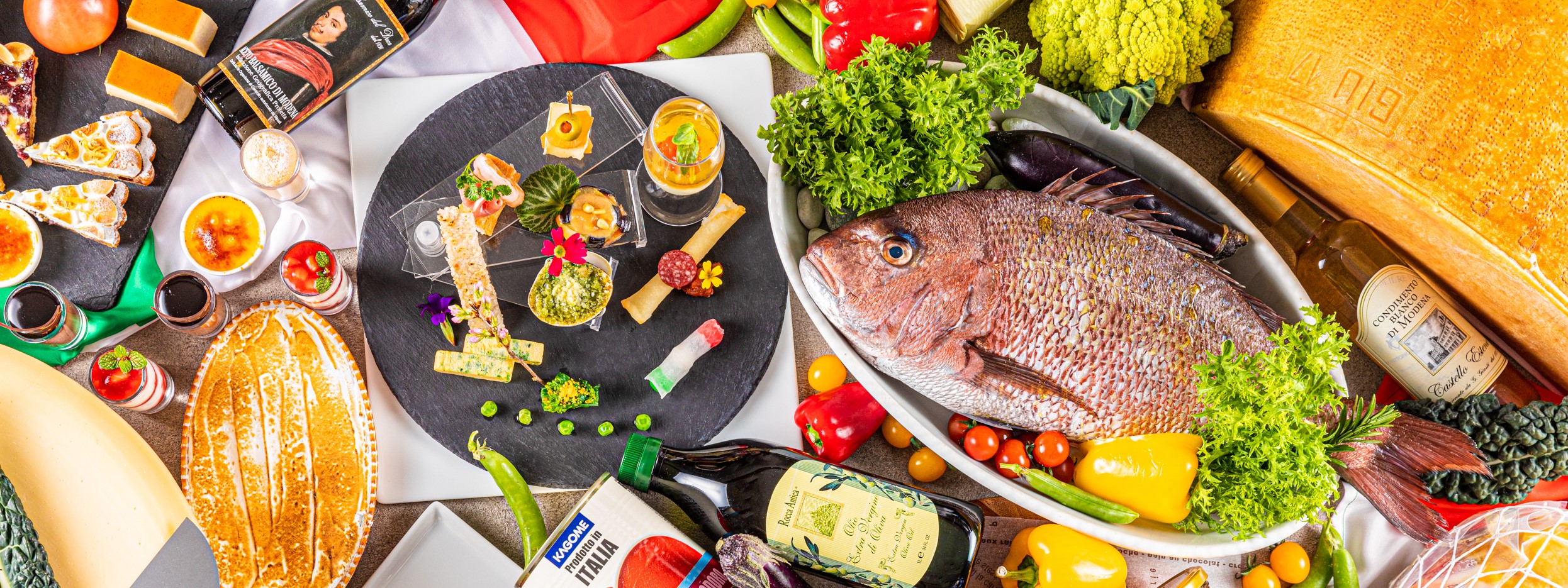 国産鶏のパン粉照り焼き ボロネーゼソース・白身魚のフリット 溜り醤油とケッパーのソース・トマト麺 バジル風味