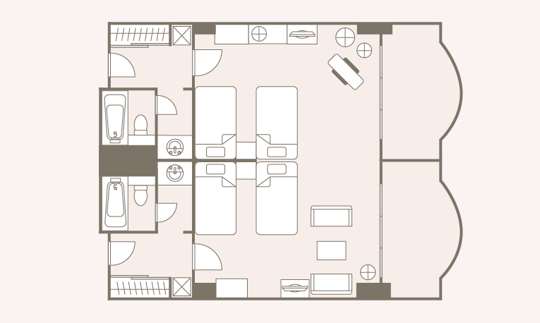 お部屋の間取りはあくまで一例です。面積や家具の配置、備品などはお部屋により異なりますので、あらかじめご了承ください。