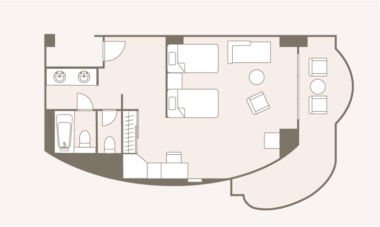 お部屋の間取りはあくまで一例です。面積や家具の配置、備品などはお部屋により異なりますので、あらかじめご了承ください。