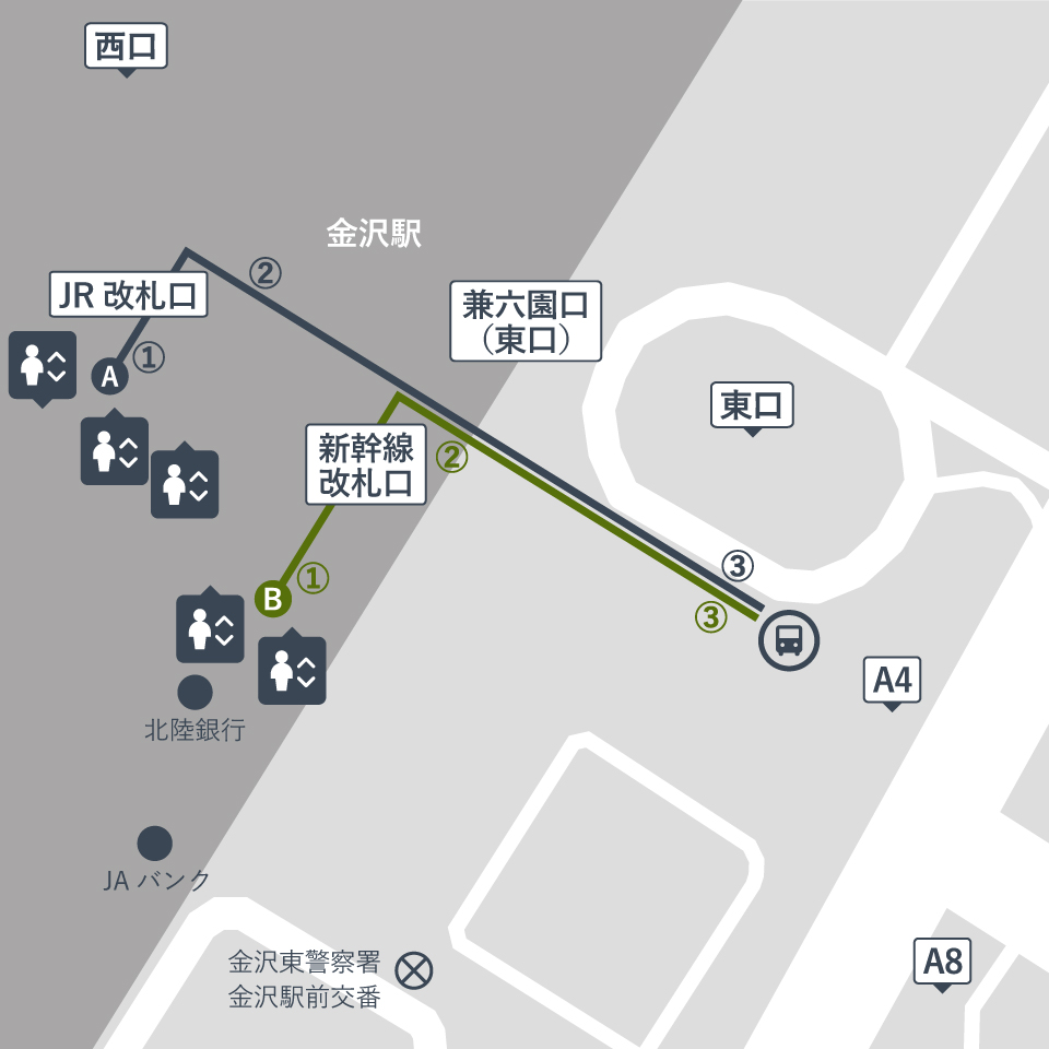 新幹線のりば改札を出たら、兼六園口(東口)右手へお進みください。