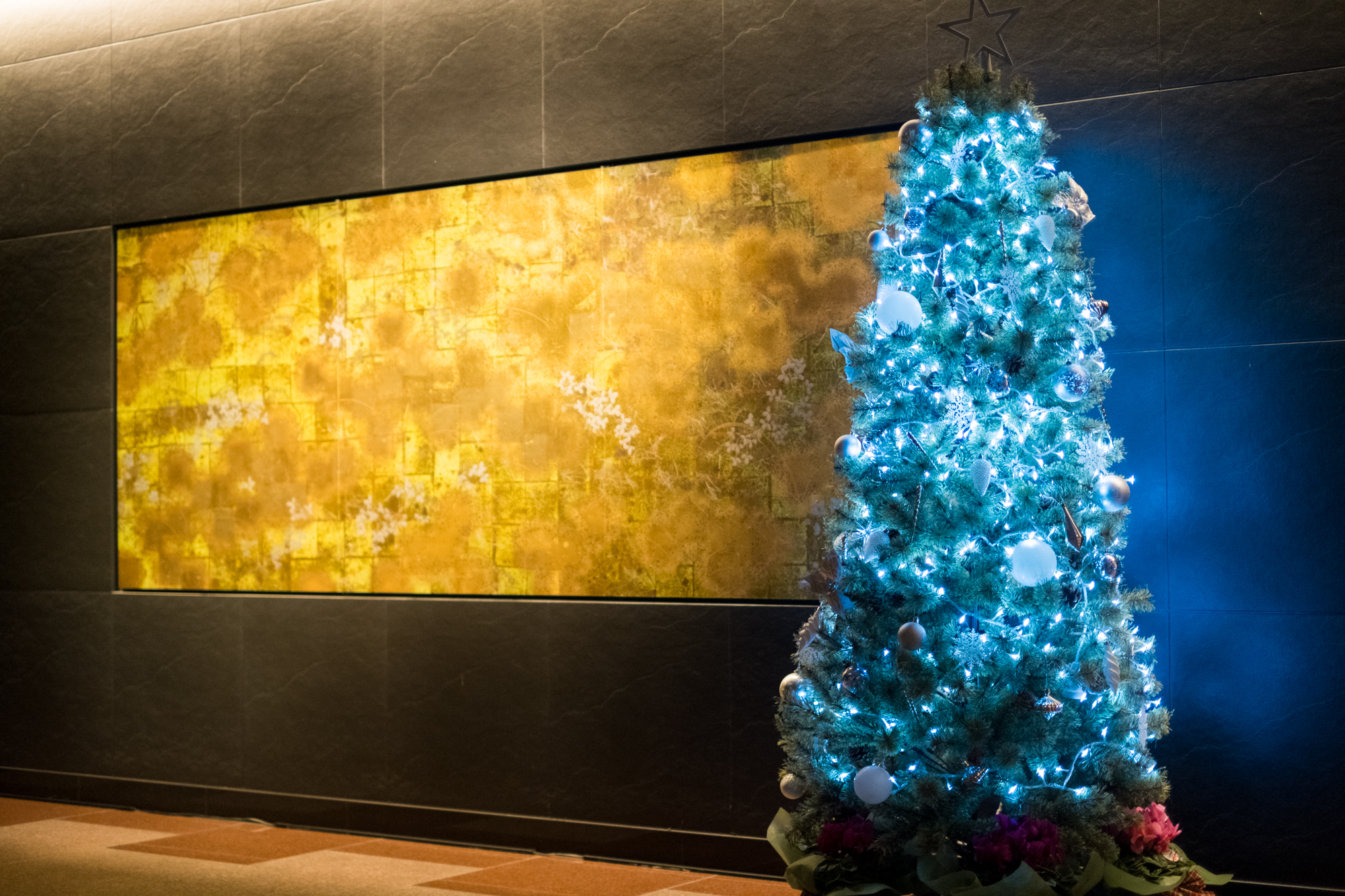 2階ロビーには金沢の金箔をイメージした和の趣あふれるクリスマスツリーが設置され、色鮮やかで緻密な刺繍が施された手毬のオーナメントが、上品で艶やかな輝きを添えています。