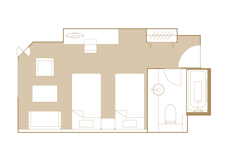 お部屋の間取りはあくまで一例です。面積や家具の配置、備品などはお部屋により異なりますので、あらかじめご了承ください。