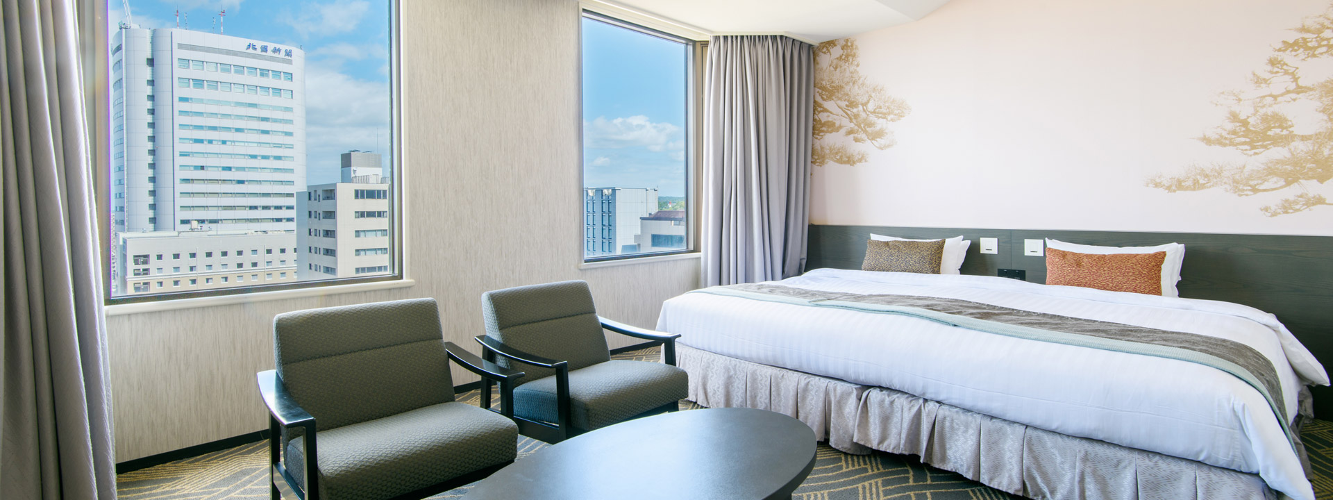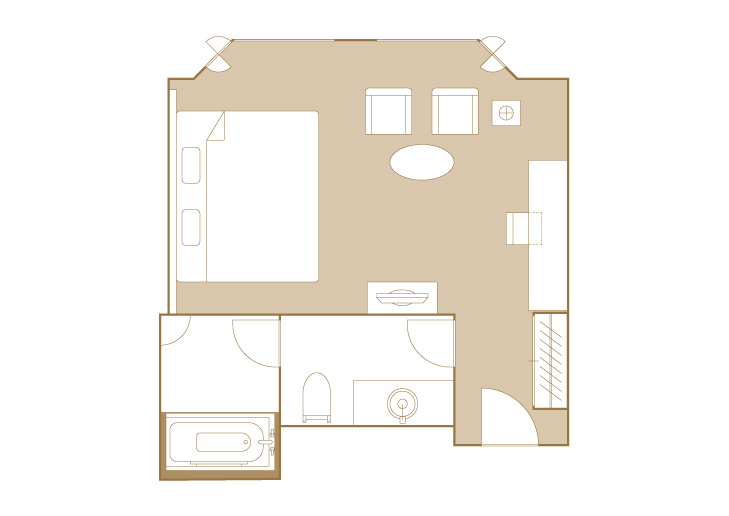 お部屋の間取りはあくまで一例です。面積や家具の配置、備品などはお部屋により異なりますので、あらかじめご了承ください。