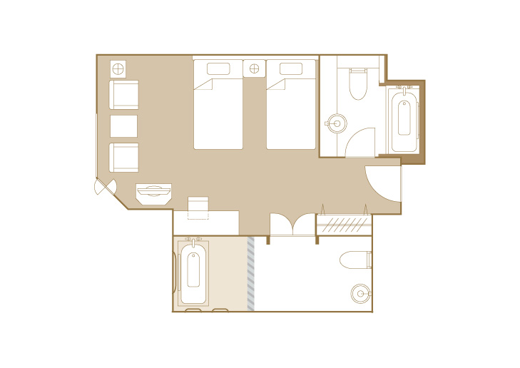 お部屋の間取りはあくまで一例です。面積や家具の配置、備品などはお部屋により異なりますので、あらかじめご了承ください。