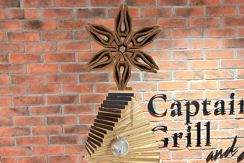 2025年12月25日(木)までの期間限定で、廃材や端材を活用したサステナブルなクリスマスツリーを、株式会社昭栄美術のご協力のもと館内の2か所に設置しています。