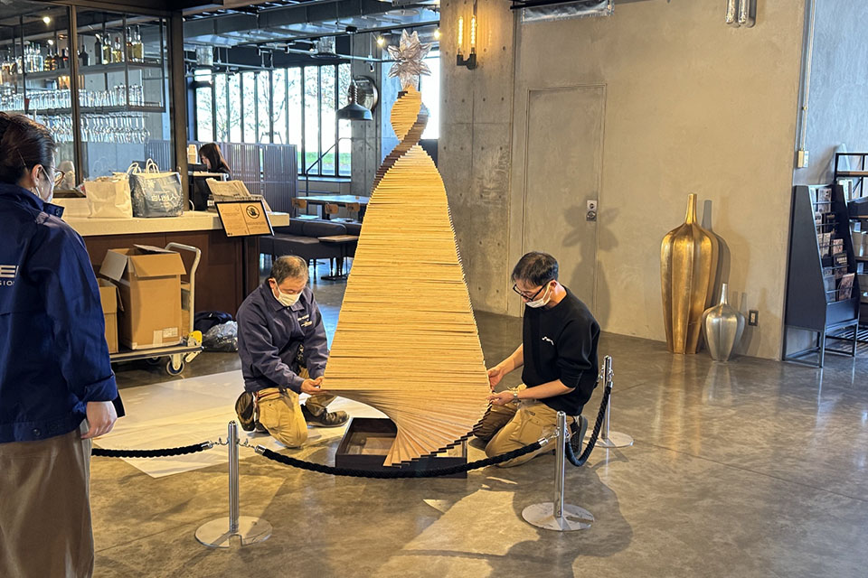 このツリーは、昭栄美術が2024年の社内プロジェクトで制作したサステナブルクリスマスツリーをベースに、当ホテルの館内の雰囲気に合わせて色味を調整したアップサイクル作品です。