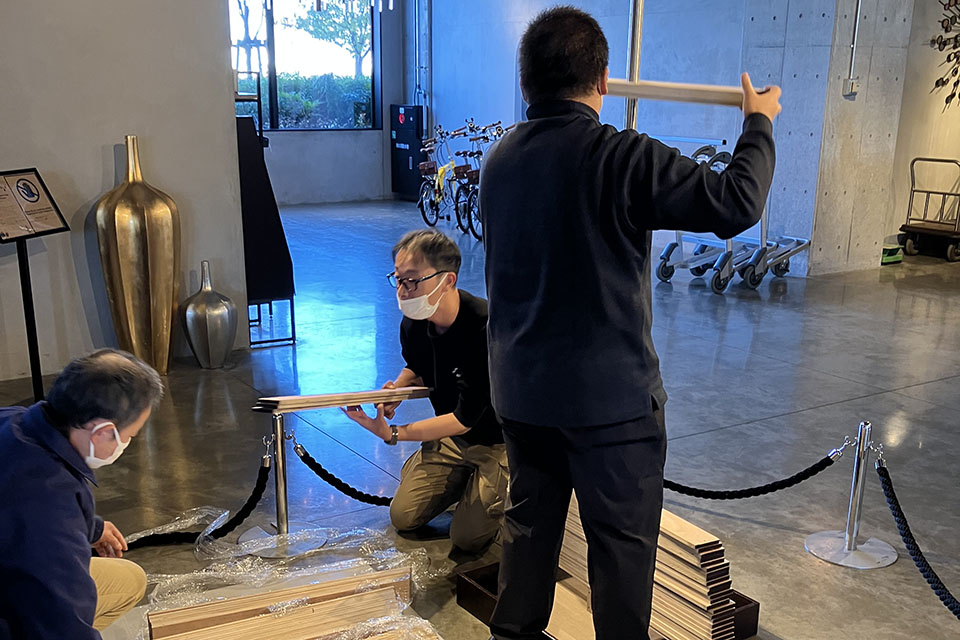 廃材の木から生まれた144枚の板を重ね合わせて形づくられており、板同士をあえて固定せず、一枚一枚を手作業で丁寧に整えて仕上げています。