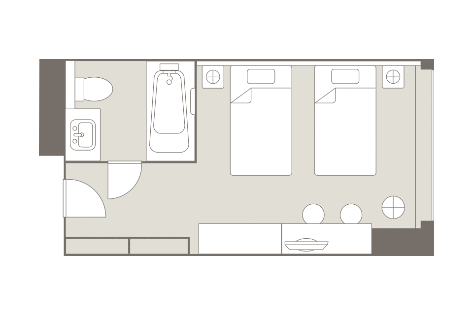 お部屋の間取りはあくまで一例です。面積や家具の配置、備品などはお部屋により異なりますので、あらかじめご了承ください。