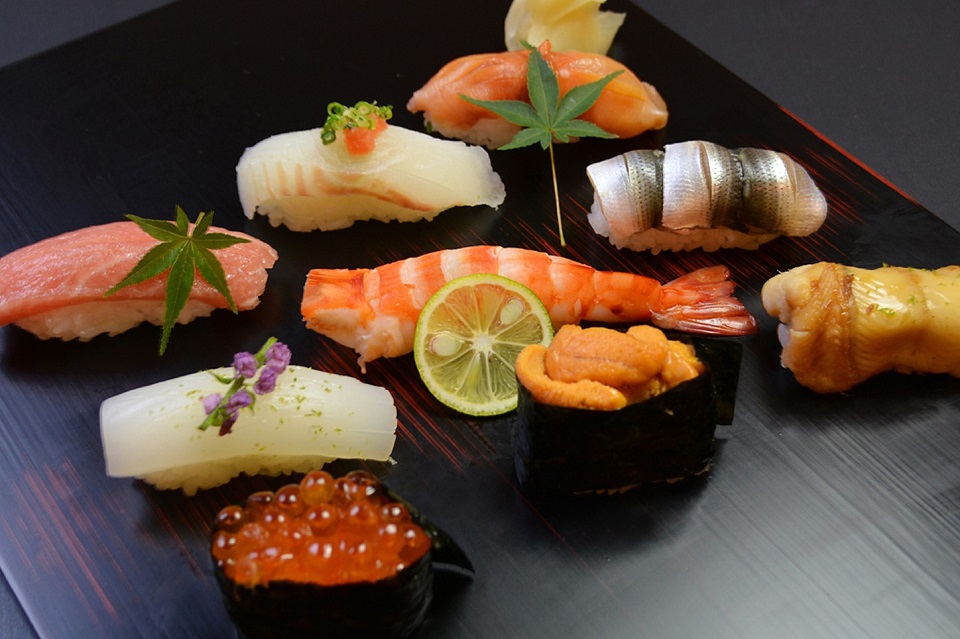 前菜3種、焼物、茶碗蒸し、鮨8貫+巻物ハーフ、椀物、デザート