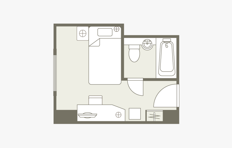 お部屋の間取りはあくまで一例です。面積や家具の配置、備品などはお部屋により異なりますので、あらかじめご了承ください。