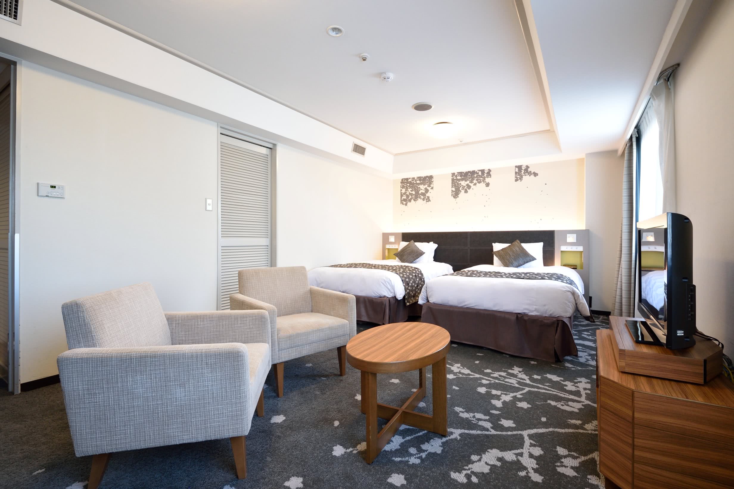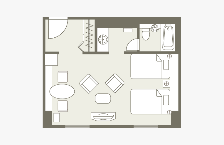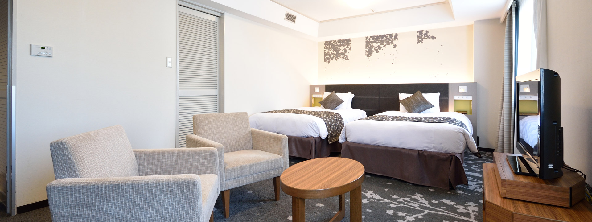 お部屋の間取りはあくまで一例です。面積や家具の配置、備品などはお部屋により異なりますので、あらかじめご了承ください。