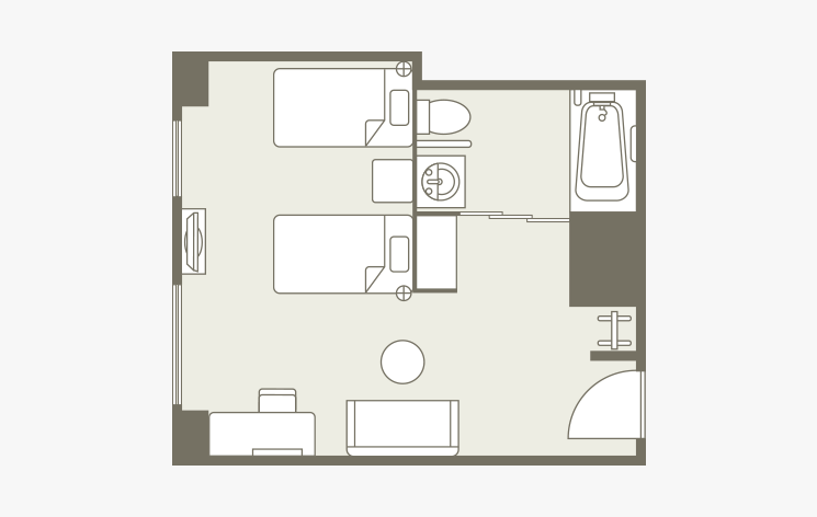 お部屋の間取りはあくまで一例です。面積や家具の配置、備品などはお部屋により異なりますので、あらかじめご了承ください。
