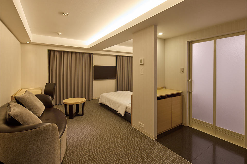 ゆったりとくつろげるソファのあるリビングスペースとベッドスペースが分かれた広い空間が魅力で