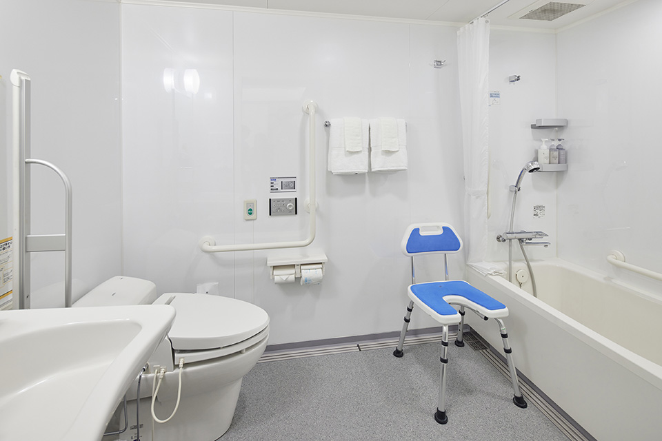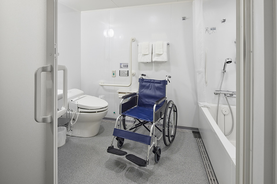 バリアフリー対応ユニットバスを備え、車いす利用時の移動にもゆとりをもたせたベッド配置。