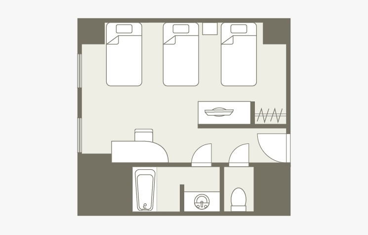 お部屋の間取りはあくまで一例です。面積や家具の配置、備品などはお部屋により異なりますので、あらかじめご了承ください。