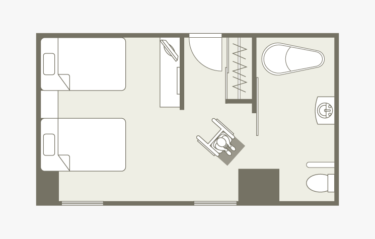お部屋の間取りはあくまで一例です。面積や家具の配置、備品などはお部屋により異なりますので、あらかじめご了承ください。