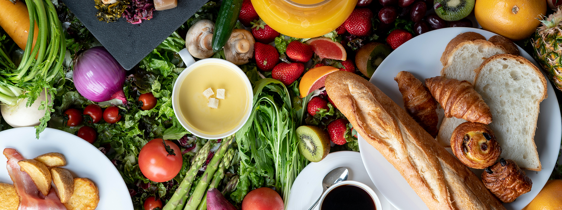 ボイルエッグ/スクランブルエッグ/スチームエッグ/ダフィネットポテト/ポークソーセージ/バジルソーセージ/ベーコン/パスタ/本日のスープ/クロワッサン/パン・オ・ショコラ/パン・オ・レザン/無添加食パン/シリアルローフ/パンプキンロール/ベリーローフ/全粒ハチミツブレッド/プチブール/パンケーキ/ミックスグリーンサラダ/ペティトマト/キュウリ/パプリカ2種/ホールコーン/ミズナ/カイソウ/オニオンスライス2種/ミックスビーンズ/キャロットマリネ/スモークサーモン/ラックスハム/ロースハム/チェダーチーズ/モッツアレラチーズとトマトのカプレーゼ/ドレッシング/シリアル3種/デザート6種/フルーツ6種