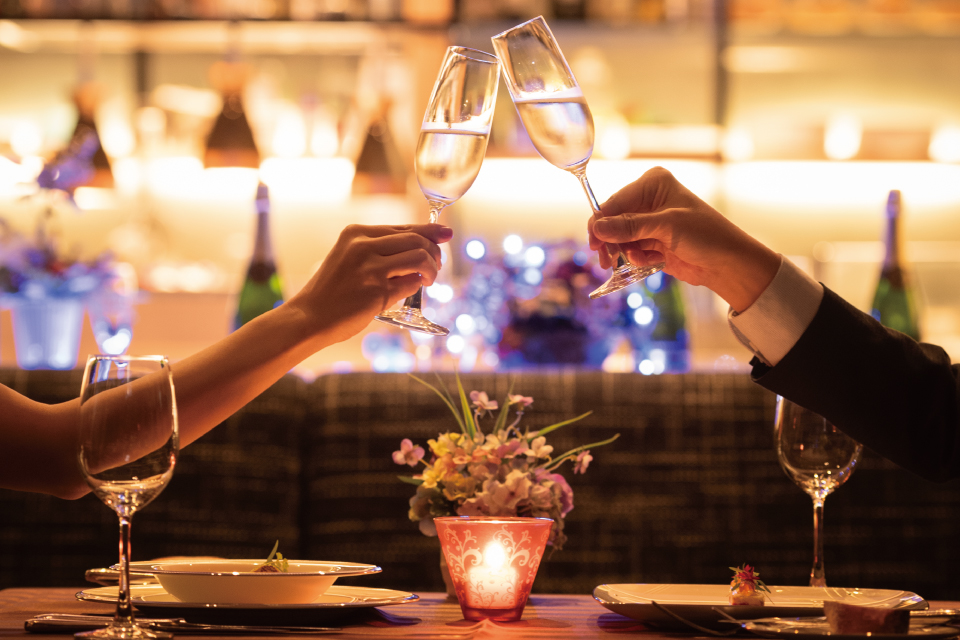 落ち着いたシックなレストランと美しい盛り付けの料理の数々