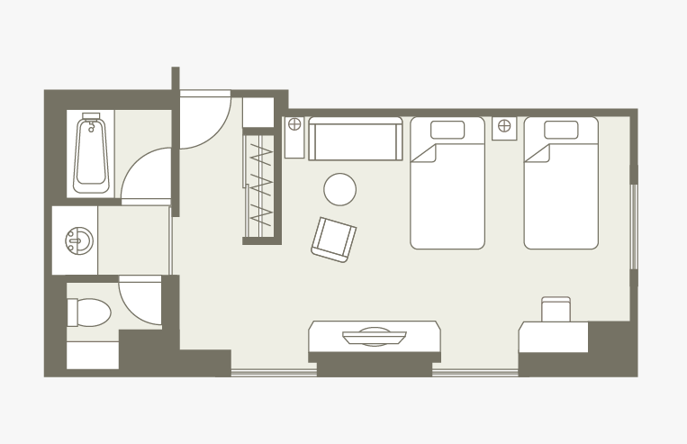 お部屋の間取りはあくまで一例です。面積や家具の配置、備品などはお部屋により異なりますので、あらかじめご了承ください。