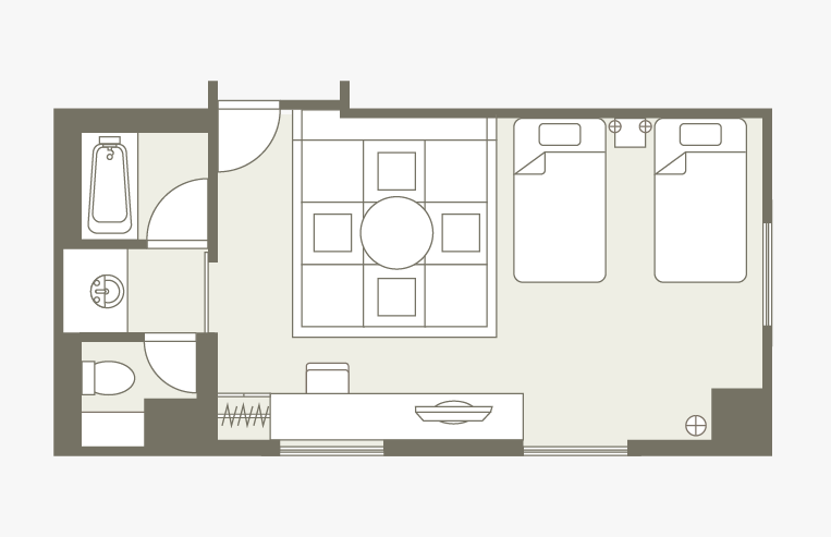 お部屋の間取りはあくまで一例です。面積や家具の配置、備品などはお部屋により異なりますので、あらかじめご了承ください。
