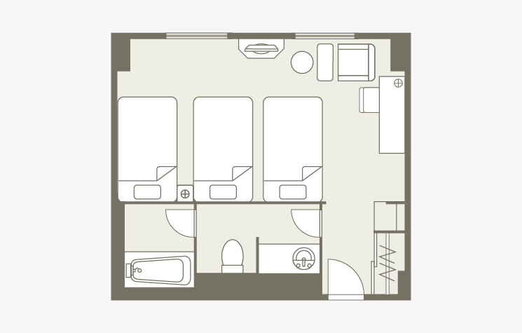 お部屋の間取りはあくまで一例です。面積や家具の配置、備品などはお部屋により異なりますので、あらかじめご了承ください。