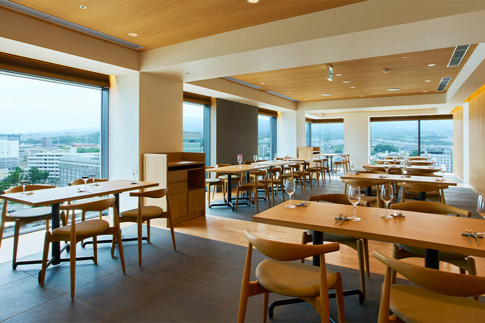 眺望と食の両方を楽しめる13階のレストラン「炉 L'EAU」。モダンな空間の中でライブ感あふれる演出やダイナミックな調理法など、新しい炉端焼きのスタイルが旅のワンシーンを彩ります。