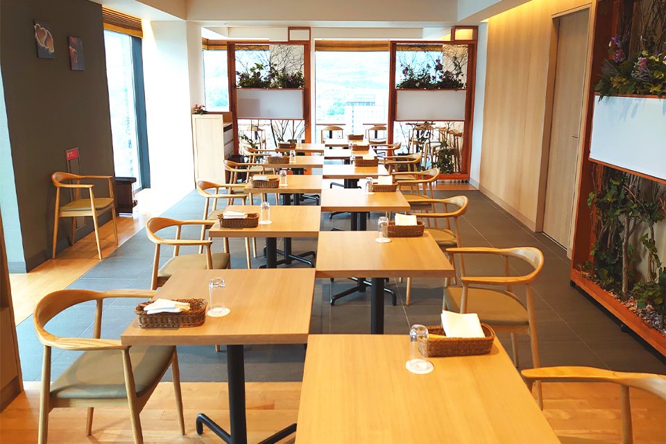 ⾼さ約2mの窓から望む豊かな眺望をお楽しみいただけるよう、⾃然と和を感じる⾊調の寛ぎの空間です。