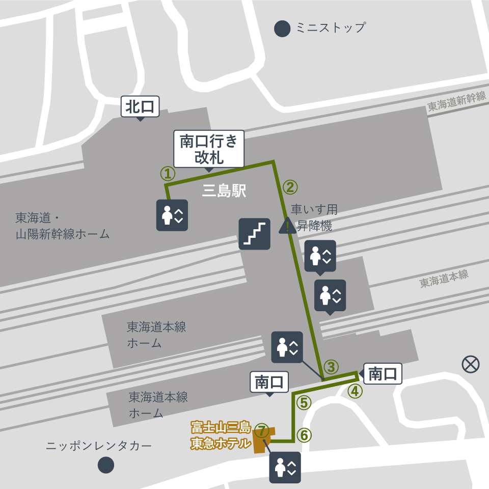 案内表示に従って道なりに進み、階段を下ります。車いす用の昇降機がございますので、三島駅駅員にお申し付けください。
