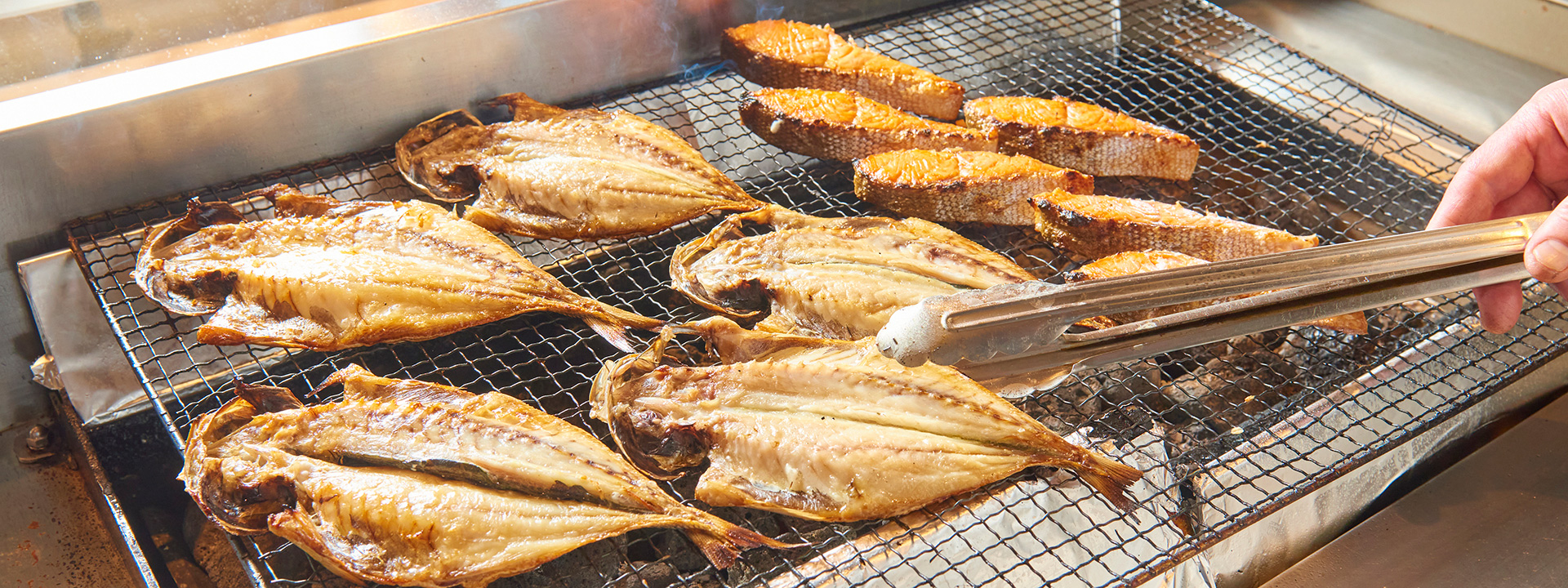 炉端で焼き上げる鯵の干物もぜひお召し上がりください。